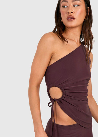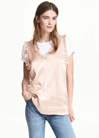 Широкая майка без рукавов из струящейся вискозы с глубоким V-образным вырезом спереди и сзади, проймы с низким вырезом и небольшой отделкой с оборками по горловине и проймам. Возможно повреждение бирки.