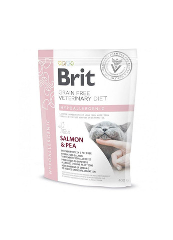 Brit GF Veterinary Diets Cat Hypoallergecnic с лососем Полнорационный и сбалансированный гипоаллергенный диетический сухой корм для котов с дерматологическими и желудочно-кишечными проблемами, вызванными отрицательной реакцией на корм (пищевая аллергия/пищевая непереносимость). ПОКАЗАНИЯ Отрицательная реакция на корм с дерматологическими симптомами Часть терапевтического подхода к дерматологическим проблемам (аллергия, атопический дерматит и отит) Отрицательная реакция на корм с симптомами со стороны желудочно-кишечного тракта Часть терапевтического подхода к нарушению работы желудочно-кишечного тракта (хроническая диарея, заболевание кишечника) СПОСОБ ПРИМЕНЕНИЯ: УСТРАНЕНИЕ ПИЩЕВОЙ АЛЛЕРГИИ И НЕПЕРНОСИМОСТИ: Давайте животному только корм Brit VD Hypoallergenic Cat и воду на протяжении 6-8 недель. Не давайте никакой другой корм для животных или продукты питания, предназначенные для человека, или добавки. ПОДДЕРЖАНИЕ ДИЕТЫ: Если устранении непереносимости и/или аллергии, можно использовать Brit VD Hypoallergenic Cat на протяжении всей жизни животного или для начала провокационного теста для монопротеиновой диеты. ТАБЛИЦА КОРМЛЕНИЯ: ВЕС КОТА (КГ) 2 3 4 5 6 8 10 12 СУТОЧНАЯ НОРМА (Г)) 55 65 70 80 85 95 100 120 СОСТАВ: дегидрированный лосось (30%), желтый горох (20%), гидролизованный белок лосося (20%), кокосовое масло, гречиха, белок из желтого гороха, яблочный жмых, соус из гидролизованного лосося (2%), рыбий жир из лосося (2%), минералы, сушеные морские водоросли (0,5% Ascophyllum nodosum), 0,4% Schizochytrium limacinum), экстракт дрожжей (источник маннан-олигосахаридов, 0,02%), β-глюканы (0,02%), облепиха (0,015%), фрукто-олигосахариды (0,013%), мохаве юкка (0,013%). ПИТАТЕЛЬНЫЕ ВЕЩЕСТВА: сырой белок 29,0%, содержание жира 17,0%, сырая клетчатка 1,5%, сырая зола 7,2%, влага 10%, омега-3 1,0%, омега-6 0,85%, кальций 1,3% фосфор 0,9% эйкозапентаеновая кислота (20:5 n-3) 0,3%, докозагексаеновая кислота (22:6 n-3) 0,55%, натрий 0,3%, магний 0,09%. ПИЩЕВЫЕ ДОБАВКИ НА 1 КГ: ВИТАМИН A (3A672A) 25 000 I.U., ВИТАМИН D3 (E671) 850 I.U., ВИТАМИН Е (3A700) 700 МГ, ВИТАМИН C 500 (3A312) 500 МГ, ХОЛИН ХЛОРИД (3A890) 2 300 МГ, БИОТИН (3A880) 4 МГ, ВИТАМИН B1 (3A821) 10 МГ, ВИТАМИН B2 30 МГ, НИАЦИНАМИД (3A315) 50 МГ, КАЛЬЦИЯ -D-ПАНТОТЕНАТ (3A841) 50 МГ, ВИТАМИН B6 (3A831) 35 МГ, ФОЛИВАЯ КИСЛОТА (3A316) 15 МГ, ВИТАМИН B12 0,03 МГ, АМИНОКИСЛОТНЫЙ ХЕЛАТ ЦИНКА ГИДРАТА (3B606) 150 МГ, АМИНОКИСЛОТНЫЙ ХЕЛАТ ЖЕЛЕЗА ГИДРАТ (Е1) 110 МГ, АМИНОКИСЛОТНЫЙ ХЕЛАТ МАРГАНЦА ГИДРАТ (Е5) 65 МГ, ЙОДИД КАЛИЯ (3B201) 4,2 МГ, АМИНОКИСЛОТНЫЙ ХЕЛАТ МЕДИ ГИДРАТ (Е4) 12 МГ, ОРГАНИЧЕСКАЯ ФОРМА СЕЛЕНА, ПРОИЗВОДНОЕ ЖИЗНЕДЕЯТЕЛЬНОСТИ ДРОЖЖЕЙ SACCAROMYCES CEREVISIAE CNCM I-3060 (ОБОГАЩЕННЫЕ СЕЛЕНОМ ИНАКТИВИРОВАННЫЕ ДРОЖЖИ) (3B8.10) 0,2 МГ, ТАУРИН (3A370) 2 600 МГ, L-КАРНИТИН 75 МГ, L-МЕТИОНИН (3C305) 4 000 МГ, ENTEROCOCCUS FAECIUM DSM 10663/NCIMB 10415 1×109 КОЕ. МЕТАБОЛИЧЕСКАЯ ЭНЕРГИЯ: 3 900 ккал/кг