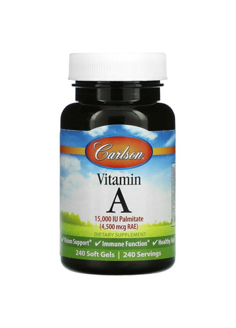 Витамин А, Vitamin A, Carlson, 15000 МЕ, 240 гелевых капсул Витамин А от Carlson — это мощная пищевая добавка, обеспечивающая наивысшее качество поддержания здоровья зрительной системы, иммунитета и кожи. Каждая капсула содержит 15000 МЕ активной формы витамина, необходимого для поддержания функциональной работы организма. Ключевые преимущества: Улучшение зрительной функции: Витамин А способствует здоровью зрения, включая ночное видение. Укрепление иммунной системы: Поддерживает нормальное функционирование иммунитета, защищая организм от инфекций. Улучшение состояния кожи: Стимулирует регенерацию клеток кожи, помогая поддерживать ее здоровье и эластичность. Рекомендации по применению: Принимать по 1 гелевой капсуле ежедневно во время еды или по рекомендации врача. Состав: Компонент Количество на порцию (1 гелевая капсула) Витамин А (как ретинил пальмитат) 15000 МЕ Другие ингредиенты: Оливковое масло (как носитель), Капсульная оболочка (желатин, глицерин, вода) Противопоказания: Перед применением проконсультируйтесь с врачом, особенно если вы беременны, кормите грудью или принимаете какие-либо лекарственные средства. Не превышайте рекомендованную дозу. Условия хранения: Хранить в сухом, прохладном месте, недоступном для детей. Не использовать, если защитная пленка повреждена или отсутствует. Где купить: Купить Витамин А можно в интернет-магазине . Преимущества покупки в нашем магазине: Быстрая доставка по всей Украине. Гарантия качества товаров от ведущих брендов. Безопасные и удобные способы оплаты. Консультации экспертов по выбору добавок и витаминов. Частые акции и скидки для постоянных клиентов. Поддержите свое здоровье с Витамином А от Carlson!