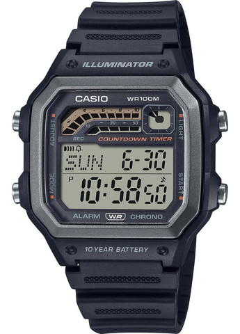 Casio WS-1600H-1A: Спортивные часы с ретро-дизайном и современными функциями Casio WS-1600H-1A — это цифровые спортивные часы, вдохновленные дизайном 1990-х годов, которые сочетают в себе классический стиль и современные функции. Благодаря трем отдельным таймерам, водозащите до 100 метров и 10-летнему сроку службы батареи, эти часы станут надежным спутником для активных людей. 🔧 Основные характеристики Механизм: Кварцевый (батарейный) Материал корпуса: Резина Стекло: Резиновое Ремешок: Резиновый Водозащита: 100 м (10 ATM) — подходит для плавания и водных видов спорта Функции: Аналоговый и цифровой дисплей Мировое время: 29 часовых поясов (48 городов), отображение кода города, включение/выключение летнего времени Секундомер: 1 секунда (верхний и нижний дисплеи), верхний дисплей до 59'59", нижний дисплей до 99'59", режимы: измеренное время, таймер события Таймер: 9 заранее установленных таймеров с отдельными временами начала для отсчета интервалов, одиночный таймер с автоповторением Ежедневный будильник и ежечасный сигнал LED-подсветка с послесвечением (Afterglow) Полный автоматический календарь (до 2099 года) 12/24-часовой формат времени Точность: ±30 секунд в месяц Габариты: 45 × 42.1 × 12.5 мм Вес: 39 г Срок службы батареи: Приблизительно 10 лет (CR2025) Цвет циферблата: Черный Страна производства: Япония Casio WS-1600H-1A — это универсальные часы, которые сочетают в себе классический дизайн и современные функции. Благодаря трем отдельным таймерам, водозащите до 100 метров и 10-летнему сроку службы батареи, эти часы станут надежным спутником для активных людей. Их мировое время, секундомер, таймеры и будильник делают их идеальным выбором для спортсменов, туристов и всех, кто ценит функциональность и стиль.
