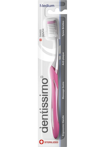 Описание Зубная щетка со щетинками средней жесткости, розовая – Dentissimo Medium Чтобы сохранить здоровье и красоту очаровательной улыбки, необходимо уделять должное внимание гигиене полости рта. Используя соответствующую зубную пасту для комплексного ухода за зубной эмалью и десной и зубную щетку средней жесткости швейцарского бренда Dentissimo, можно получить желаемый результат от гигиенических процедур. Этот инструмент изготовлен в розовом цвете, а средняя жесткость щетинок – универсальный параметр для деликатной, но действенной очистки даже чувствительной зубной эмали. Благодаря особому дизайну щетка проникает даже в труднодоступные места, в то же время не повреждая десну и слизистую. Эргономичная ручка удобно ложится в руку и позволяет с большим комфортом совершать гигиенические процедуры. Небольшое количество зубной пасты нанести на зубную щетку. Чистить зубы круговыми движениями, одновременно аккуратно массируя десну. Полость рта прополоскать небольшим количеством воды, задерживая ее на 20-30 секунд.