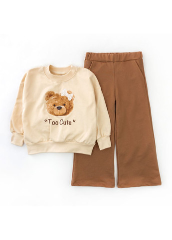 Стильный комплект для девочки - свитшот и штаны. Свитшот с манжетами бежевого цвета с принтом мишки. Штанишки на резинке цвета корицы прямого кроя с кармашками. Комплект пошит из двунитки с начесом. Состав: 100% хлопок. Размер 98 - длина кофты 37 см, полуобхват кофты 35 см, рукав от горловины 38 см, длина штанов 58 см, полуобхват штанов 29 см, шаговый 37 см. Размер 110 - длина кофты 43 см, полуобхват кофты 37 см, рукав от горловины 44 см, длина штанов 64 см, полуобхват штанов 32 см, шаговый 44 см. Размер 116 - длина кофты 44 см, полуобхват кофты 37 см, рукав от горловины 45 см, длина штанов 69 см, полуобхват штанов 34 см, шаговый 47 см. Артикул: 329521