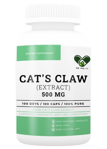 En`vie Lab Cat's Claw - веганская добавка в виде капсул, содержащая кору кошачьего когтя - тропической древовидной лианы. Обладает комплексным противовоспалительным и антиоксидантным действием. Улучшает пищеварение, поддерживает сердечно-сосудистую, мочеполовую, опорно-двигательную систему. Блокирует активность вирусов и свободных радикалов. Снимает симптомы и ликвидирует причину заболевания. Преимущества Cat's Claw: - оказывает противовирусное и антибактериальное действие; - снимает воспалительный процесс; - повышает иммунитет; - улучшает микроциркуляцию крови; - оказывает антиоксидантное действие; - полезен при расстройствах пищеварения; - поддерживает сердечно-сосудистую систему; - укрепляет мышцы и кости; - улучшает усвоение витамина С; - служит для профилактики онко-заболеваний. Способ употребления: Принимать по 2 капсулы 2–3 раза в день, желательно во время еды. Предостережение: При беременности, кормлении грудью, приеме медицинских препаратов или наличия любых заболеваний следует проконсультироваться с врачом перед употреблением пищевых добавок. В случае возникновения побочных реакций прекратите использование и проконсультируйтесь с врачом. Хранить в недоступном для детей месте. Не использовать, если внешняя защитная мембрана отсутствующая или повреждена. *** Производитель оставляет за собой право изменить внешний вид упаковки, состав и/или консистенцию продукта. **** БАД не является лекарственным средством!
