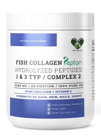 Коллаген FISH COLLAGEN COMPLEX 5 с гиалуроновой кислотой, биотином, МСМ и витамином С в порошке 1 и 3 типа (морской, рыбий) от бренда En`vie Lab - ваш шаг к здоровью и красоте. Преимущества рыбного пептидного коллагена: Высокая биодоступность делает его более эффективным по сравнению с другими формами коллагена. Гиалуроновая кислота помогает сохранить влагу и упругость кожи. Буферизированный витамин С обеспечивает лучшее усвоение и защиту клеток. Биотин придает силу волосам и препятствует их выпадению. Советы для достижения лучших результатов: Увеличьте потребление воды в течение дня, чтобы увеличить эффективность продукта Если ощущаете жажду, предпочтение отдавайте стакану чистой воды. Временно ограничьте потребление алкоголя, сигарет, белого хлеба, сахара, соли, фаст-фуда, копченостей и полуфабрикатов. Выбирая этот коллаген, вы выбираете качество и красоту изнутри, так как он производится французским производителем Peptan с высоким содержанием активных компонентов. Рекомендации по приему: Принимайте 1 порцию (3/4 чайной ложки) утром натощак, разведенную в 200-300 мл воды или сока. Подождите 40-60 минут перед завтраком, чтобы коллаген полностью усвоился. Предостережение: При беременности, кормлении грудью, приеме медицинских препаратов или наличия любых заболеваний следует проконсультироваться с врачом перед употреблением пищевых добавок. В случае возникновения побочных реакций прекратите использование и проконсультируйтесь с врачом. Хранить в недоступном для детей месте. Не использовать, если внешняя защитная мембрана отсутствующая или повреждена. *** Производитель оставляет за собой право изменить внешний вид упаковки, состав и/или консистенцию продукта. **** БАД не является лекарственным средством!