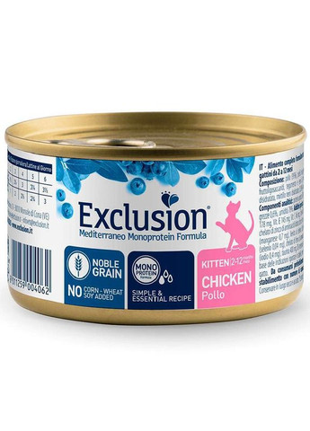 Преимущества: Корм более питателен, благодаря дегидрированному монопротеину животного происхождения; Корм полностью отвечает возрастным и пищевым потребностям маленьких котят; В рецептуре нет пшеницы или кукурузы; В составе только благородное зерно самого высокого качества; В состав корма входят ягоды граната, ежевики, малины и черники, богатые антиоксидантами и помогающие нейтрализовать свободные радикалы в организме кота; Формула корма помогает бороться с последствиями оксидативного стресса; Обогащен псилиумом и лингоцеллюлозой, препятствующих образованию комочков шерсти в желудке; Здоровое состояние шерсти и кожи поддерживается благодаря лососевому маслу в составе; В составе используются только натуральные консерванты. Состав: дегидрированное мясо курицы (32%), горох, рис, свиной жир, дрожжи, гидролизованный протеин животного происхождения с низкой молекулярной массой, сушеный цикорий, лососевое масло (1%), лингоцеллюлоза (1%), (0,5%), хлорид натрия, псилиум и семена подорожника (0,3%), МОС (мананолигосахариды) (0,3%), дегидрированный гранат (0,1%), дегидрированная черника (0,1%), дегидрированная ежевика (0,1%), дегидрированная малина (0,1%), юка моджаве. Добавки (на 1 кг): Витамин A 25.400 МЕ, Витамин D3 1.000 МЕ, Витамин E 800 мг, Витамин C 255 мг, Витамин B1 13,5 мг, Витамин B2 27 мг, Витамин B3 25 мг, Витамин , Витамин B12 0,12 мг, Фолиевая кислота 2,5 мг, Витамин H 0,12 мг, Бетаин 2.400 мг, Медь (хелат меди гидрат аминокислот) 4 мг, Цинк (хелат цинка гидрат аминокислот) 50 мг гидрат аминокислот) 4 мг, Селен (селенит натрия) chelato 0,2 мг, Железо (карбонат железа) chelato 28 мг, Йод (калия йодид) 2,2 мг, Таурин 2.260 мг, DL-метионин 250 мг Аналитические компоненты: сырой белок 36%, сырой жир 18%, сырая зола 5,6%, сырая клетчатка 2,3%, влажность 8%, кальций 0,8%, фосфор 0,7%, магний 0,09%, омега -3 жирных кислот 0,5%, омега-6 жирных кислот 2,6%. Антиоксиданты: Токоферол (из растительного сырья) 160 мг *Информация о нутриентном составе и ингредиентах на сайте является справочной. Вся полная информация о товаре на упаковке. Суточная норма кормления: Возраст животного (мес.) 2 3 4 6 8 10-12 Вес котёнка (кг) 0,5-1 1-1,5 1,5-2,5 2,5-3 3-3,5 3-5 Суточная норма корма (г/добу) 30-50 50-70 70-80 80-90 80-90 80-100 Проследите, чтобы у любимчика был постоянный доступ к питьевой воде. Каждый кот это яркая индивидуальность и поэтому нормы кормления в каждом частном случае будут отличаться, в зависимости от породы, активности, возраста и окружающей среды. Фасовка: 300 г, 1,5 кг, 12 кг Производитель: Exclusion, Dorado S.r.l., Италия