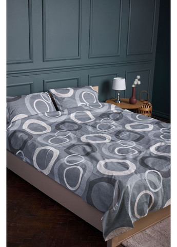 Комплект постельного белья Family Linens с абстрактным дизайном. Ткань имеет серый фон с узором, состоящий из кольцевидных форм разных размеров, выполненных в бежевых, светло-серых и темно-серых оттенках. Постель выглядит современно и гармонично вписывается в интерьер со спокойными цветами.