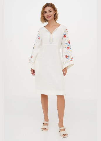 Длинное, свободное вышитое платье под пояс в стиле "Прованс". В боковых швах расположены карманы, а по низу - разрезы. Длина рукава регулируестя патой и фиксируется пуговицей. Застежки нет. (Код 0232/56/606)