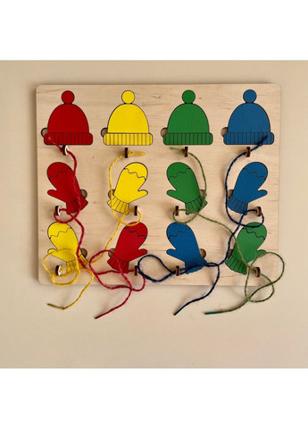 Ребенку предлагается собрать комплект «шапка-перчатка» по цвету (или определенной последовательности) и объединить его шнурочком.
