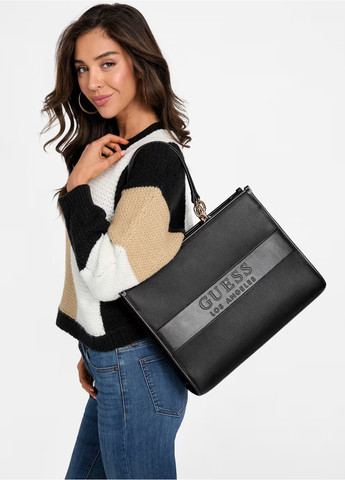 Женская сумка тоут Guess. Невероятно удобная и качественная сумка на каждый день. Сумка с тремя отделениями. Сумка закрывается с помощью молнии. Одно из отделений закрывается на еще одну молнию. Внутри сумки есть четыре кармана, один из которых на молнии. Сумка с двумя ручками, которые позволяют носить сумку в руке и на плече. Спереди гладкая вставка из экокожи с выпуклым логотипом бренда. Размеры сумки: 37,5*29*12 см. Отличное качество.