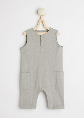 Baby Exclusive. Комбинезон без рукавов из мягкого хлопкового трикотажа с застежкой на пуговицах вверху и ребристыми украшениями на вырезе и проемах. Нашивные боковые карманы с открытыми закатанными краями, скрытые застежки-застежки в промежности и штанинах и фиксированные манжеты на штанинах.