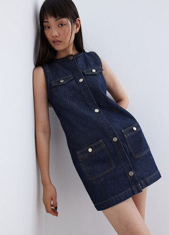 Короткое платье без рукавов из плотного хлопкового денима. Платье с круглым вырезом и застежкой на пуговицы, декоративными клапанами на груди и карманами на молнии спереди. Для размера XXS: ПОГ-41 см, длина-75 см.