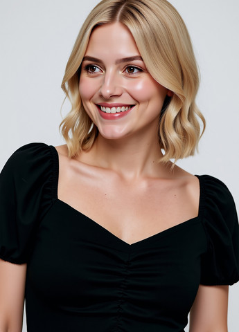 Крой с подчеркиванием талии, укороченный крой, короткий рукав, квадратный вырез. Рост модели: 174 см.