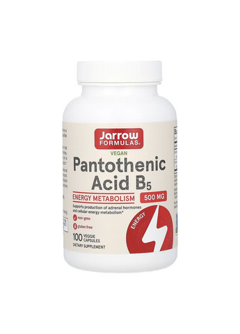 Веганский продукт Энергетический обмен Сертификат Non-GMO Project Verified Без глютена Диетическая добавка Энергия Поддерживает выработку гормонов надпочечников и энергетический обмен на клеточном уровне. Пантотеновая кислота – это незаменимый витамин группы B, который поддерживает метаболизм жиров, углеводов и белков для выработки клеточной энергии и имеет решающее значение для выработки гормонов и красных кровяных телец. Рекомендации по применению Принимать по 1 капсуле в день во время еды или по рекомендации квалифицированного медицинского работника. Другие ингредиенты Капсула (гидроксипропилметилцеллюлоза, вода), микрокристаллическая целлюлоза и магния стеарат (растительного происхождения).