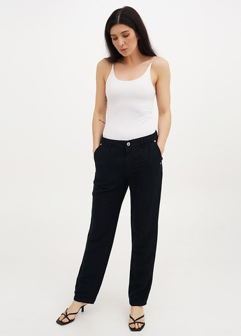 Брюки зауженные, однотонные, без застежки, пояс на резинке, сзади два прорезных кармана, спереди два кармана на молнии, по низу разрезы.