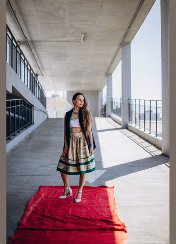 Легкий А-силуэт, лаконичный и при этом роскошный образ. Платье создано из тонкой натуральной шерсти красного цвета. Рукав с принтом – воспроизведение старинной вышивки Полтавщины. Единственный экземпляр.