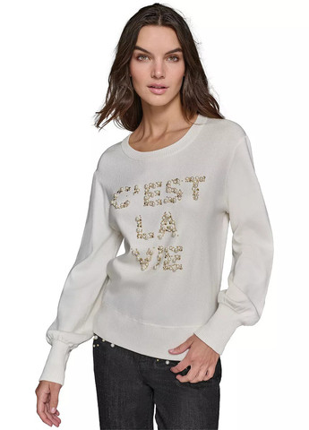 Женский свитер Karl Lagerfeld Paris. Очень мягкий, эластичный и стильный свитер, украшен сверкающими камнями, стразами и бусинами спереди. Теплый и мягкий свитер. Красивая вязка. Приятный к телу материал. Круглый вырез горловины, манжеты и низ свитера в рубчик. Отличное качество.