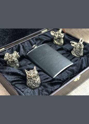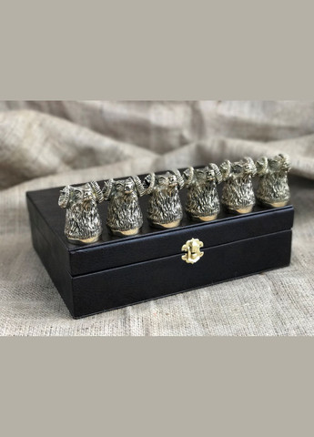 Стопки перевертыши Люкс Nb Art 4 штуки с флягой 48440016 1. Чарка-30 мл: высота 70 мм, ширина 40 мм, художественное литье из бронзы, внутри покрытие булатом - 7 видов голов (кабан, филин, бык, баран, рысь, медведь, лось) на выбор - 4 шт. Все чарки ставятся на голову! 2. Фляга из нержавеющей стали, обтянута натуральной кожей – 1 шт 3. Подарочный футляр: материал коробки МДФ обтянутый кожзаменитель, внутренность – черный бархат Подарочные стопки-перевертыши оригинальный подарок на любой праздник.