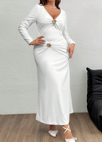Элегантное платье из ткани средней эластичности. Глубокий V-образный вырез, облегающий крой. Подходит для различных случаев, включая свидания и вечеринки.