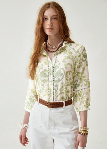 Женская блузка Florisole с зеленым цветочным принтом. Имеет V-образный вырез и рукава-бишоп. Блузка предназначена как для повседневной носки, так и для особых случаев.