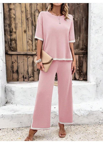 В комплект входят свитер с рукавами реглан и трикотажные брюки. Свитер имеет свободный крой и высокий вырез. Ткань имеет среднюю эластичность.
