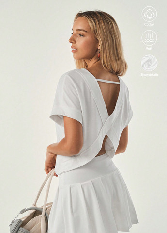 Женская повседневная футболка с круглым вырезом и короткими рукавами изготовлена из трикотажного полотна средней эластичности. Имеет классический крой и стандартную длину. Футболка дополнена перекрещивающимися деталями на спине и вырезами.