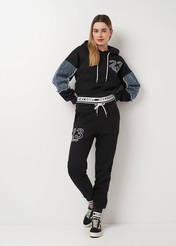 Впереди худые с карманами кингуру, есть надпись из черных букв. На рукаве аппликация из камешков и накаткой.