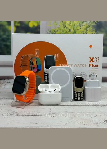 Набор – это интегрированное решение для современного и активного образа жизни. Этот набор сочетает в себе новейшие технологии и стильный дизайн для обеспечения максимального комфорта в ежедневных делах. Состав набора: Смарт-часы SmartWatch Ultra 2: Полный контроль над своим здоровьем и активностью со встроенным пульсометром, шагомером и функцией сна. Большой сенсорный экран обеспечит удобное взаимодействие и предоставит вам доступ к различным функциям. Наушники Air Pro: Наслаждайтесь идеальным звуком благодаря беспроводным наушникам Air Pro. Их стильный дизайн и удобная посадка обеспечат вам максимальный комфорт при прослушивании музыки или ответе на звонки. Павербанк: Обеспечьте себя энергией в любой момент благодаря мощному павербанку. Заряжайте ваши устройства в пути и длительных путешествиях, не теряя связи или развлечений. Телефон 5. Блок питания Этот набор идеально подходит для тех, кто ценит комбинацию стиля, удобства и передовых технологий. Наслаждайтесь своей жизнью, будьте всегда на связи и на шаг впереди с Набором