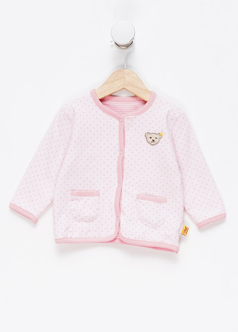 Кофта их качественного трикотажа, двухсторонняя. Одна сторона- розового цвета в полоску, другая- в мелкую точку. Застежка по всей длине на кнопках, два накладных кармана.