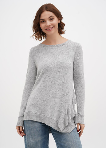 Лонгслив серый меланж, круглый вырез горловины, длинный рукав, асимметричный низ, волан.