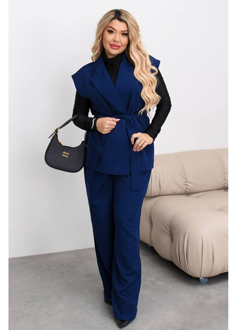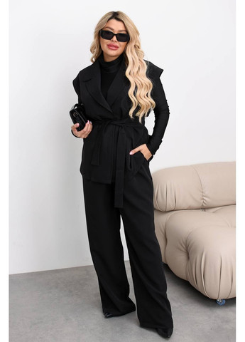 Элегантный костюм-двойка из костюмной ткани – выбор для женщин, которые ценят комфорт и стиль. Прямые брюки визуально вытягивают силуэт, а удлиненный жилет с английским воротником придает образу утонченности. Модель на запахе с поясом акцентирует талию, создавая женственный силуэт. Идеален как для деловых встреч, так и для стильных прогулок по городу.
