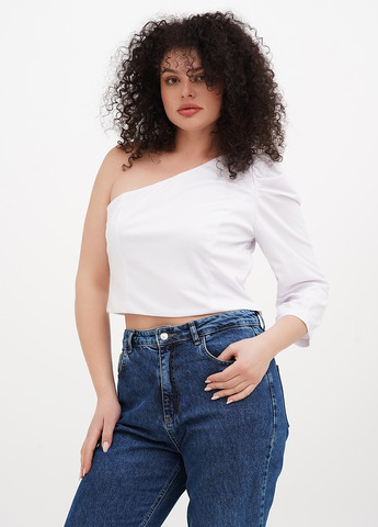 Белый топ с одним рукавом. Идеально подойдет как к джинсам так и брюкам, юбкам, шортам. Рукав фонарик со зборкой. Сбоку скрытая молния. На размер XL длина изделия 47 см, длина рукава 53 см.