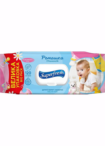 Влажные салфетки – это отличное изобретение, которое дает возможность обеспечить чистоту и комфорт ребенку с первых дней жизни. Специалисты компании Superfresh создали для современных мам незаменимую вещь, с помощью которой можно легко устранить загрязнение, если поблизости нет мыла и воды, вытереть руки перед лицом и после приема пищи, а также для других, как привычных, так и неожиданных ситуаций, естественных для малышей. В упаковке имеется 120 салфеток, для лучшей сохранности которых предусмотрен специальный клапан. Каждый влажный платочек обладает мягкой и прочной текстурой, благодаря чему обеспечивается деликатный уход за чувствительной кожей. Салфетки пропитаны специальным раствором и не содержат спирта.