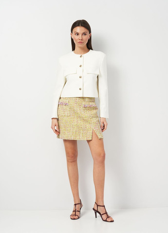 Блуза свободного кроя, с V-образным вырезом. Расклешенный рукав. Блуза с подкладкой-майкой на бретелях, которая пришита на петлях изнутри изделия. Декорирована пестрыми рюшами по всему изделию и завязкой на груди. На фото размер S: длина изделия 63 см, длина рукава 60 см.