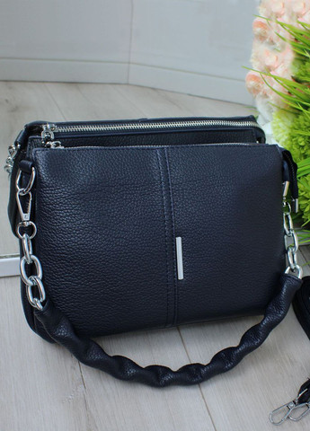 Выполнена из экокожи. Размеры изделия(см): ширина 25 см, высота 16 см. Сумка закрывается на молнию и имеет три отделения: два открытых и одно на молнии. Внутри есть открытый карман и карман на молнии. Спереди и сзади расположены карманы на молнии. Длина ремешка регулируется до 140 см, длина ручки – 49 см. Металлическая фурнитура.
