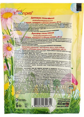 Детское гель-мыло "Увлажняющее" (duo-pack) - Мой Каприз Предлагаемое вашему вниманию детское гель-мыло «Увлажняющее» имеет приятный запах, нежную консистенцию и выраженное свойство питать и увлажнять детскую (и зрелую) кожу. Удобная упаковка (duo pack) емкостью 450 мл порадует каждую заботливую хозяйку, поскольку такая покупка способствует рациональному использованию семейного бюджета. Торговая марка «Мой каприз» от украинской компании «Альянс красоты» имеет отличную репутацию на рынке благодаря высокому качеству продукции, сертифицированной в соответствии с законодательством. Детское гель-мыло «Увлажняющее» содержит ряд активных компонентов, эффективность которых подтверждена в ходе лабораторных исследований и потребительского тестирования. Благодаря содержанию оливкового масла, экстракта лекарственной ромашки и липового цвета средство обладает бактерицидными, противовоспалительными и заживляющими свойствами. Очистка нежной детской кожи происходит мягко и бережно. После использования мылая кожа становится нежной, мягкой, приятной на ощупь. Активные компоненты: оливковое масло, ромашка, цветы липы Время применения: универсальный Тип кожи: все типы Возраст: от 3 лет Пол: детский унисекс Объем: 450ml Производитель: Альянс красоты (Украина) Сделано в: Украина Способ применения Нанесите на влажную кожу. Состав Aq, Sodium Laureth Sulfate, Disodium Sulfosuccinate, Sodium Chloride, Cocamidopropyl Betaine, PEG-4 Rapeseed Amide, PEG-150 Polyglyceryl-2 Tristearate (и) Laureth-3 (and) Dipropylene Glycol, PEG-7 Glyceryl Стирен/Acrylates Copolymer (and) Coco-Glucoside, PEG-40 Hydrogenated Castor Oil, Hydroxypropyl, Methylcellulose, Polyqternium-7, Benzyl Alcohol, 5-Chlor-2-Methyl-4-Isotiazolinone, Hydroxye Extract, Tilia cordata Extract, Allantoin, EDTA, Olive Oil Polysorbate Esters, Citric Acid.