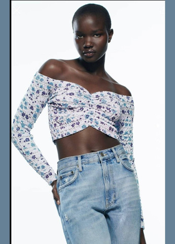 Zara Жаккардовый укороченный топ из жатой ткани Элегантный укороченный топ из жаккардовой жатой ткани с длинными рукавами. Глубокий V-образный вырез с драпировкой подчёркивает декольте и придаёт образу женственности. Идеален для вечерних выходов и стильных повседневных луков.