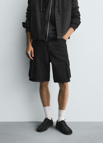 Шорты свободного кроя из хлопкового денима. Пять карманов. Накладные карманы с клапанами на штанинах. Эффект потертости. Застежка-молния и пуговица.
