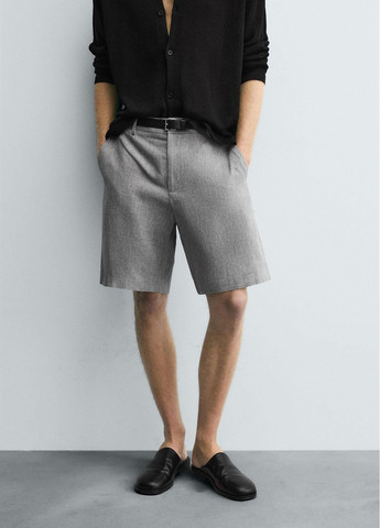 Шорты-бермуды средней посадки с петельками для ремня. Боковые карманы и прорезные карманы сзади. Деталь со складками. Застежка спереди на молнию, внутренняя пуговица и металлический крючок.