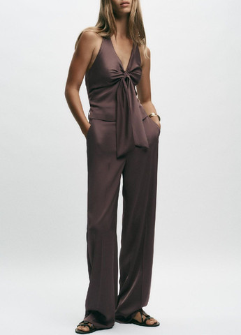 Комбинезон с высоким воротником-халтером, V-образным вырезом, деталью с узлом и открытой спиной. Вырез на талии, передние карманы и прямые штанины. Застежка на молнию спереди, внутренняя застежка на пуговицу и крючок.