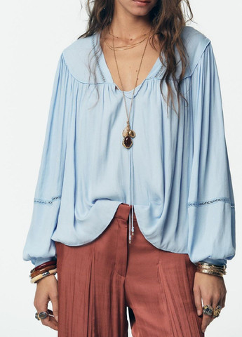 ZARA WOMAN COLLECTION Удлиненный топ из вискозной ткани. V-образный запах и длинные рукава-буффы с эластичными манжетами. Регулируемый пояс из той же ткани с металлической пряжкой. Асимметричный низ.
