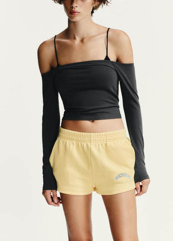 Топ с прямым вырезом горловины и длинными рукавами с открытыми плечами. Мягкая ткань. Прямой крой.