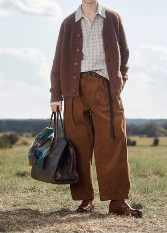 Пиджак стандартного кроя из хлопкового бархата. С воротником-лацканом с зубцами, длинными рукавами с манжетами на пуговицах, нагрудным прорезным карманом, карманами с клапанами на бедре, внутренним карманом и шлицами сзади. Застёгивается на пуговицы спереди.