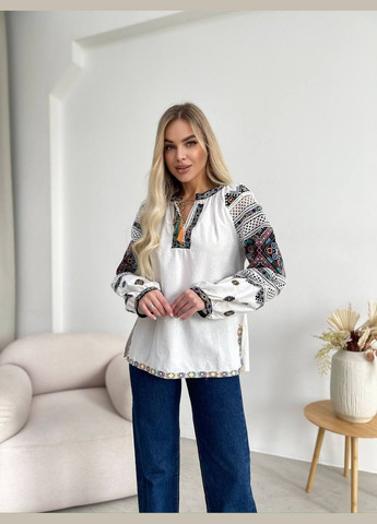 Женская вышиванка - это традиционная украинская рубашка, изготовленая из льняной ткани (80% лен, 20% полиэстер), которая имеет вышивку этничного мотива. Модель свободного прямого кроя, с длинными рукавами. Льняные вышиванки очень популярны среди украинских женщин и могут использоваться как национальный атрибут, а также как элемент современного стиля. Они могут иметь разные вариации фасонов и декора, что делает их универсальными для разных случаев - от повседневной носки до праздничных мероприятий.