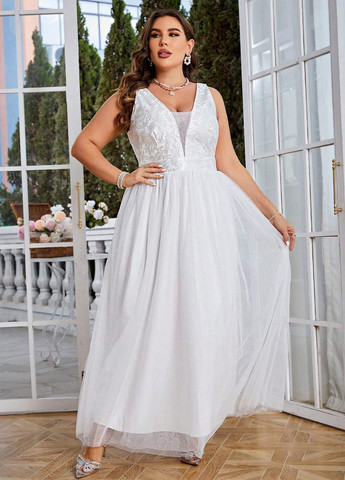 Наше свадебное платье из контрастной сетки Simplee Plus отличается глубоким V-образным вырезом, дизайном без рукавов и длинной длиной. Изготовлено из неэластичной ткани. Платье также включает контрастные сетчатые детали для дополнительного визуального интереса.
