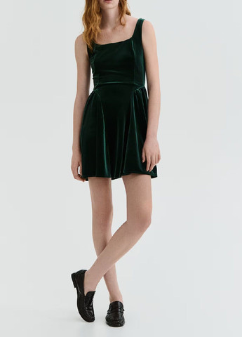 Короткое платье из мягкого велюра с квадратным вырезом и широкими бретелями. Облегающий лиф и расклешенная юбка со сборками на бедрах для дополнительного объема. Частично на подкладке.