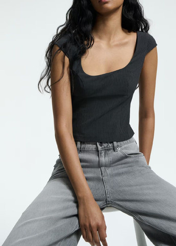 Облегающий укороченный топ из тканого материала с рукавами-крылышками и глубоким квадратным вырезом спереди и сзади. Утягивающие швы спереди и сзади. Частично на подкладке.