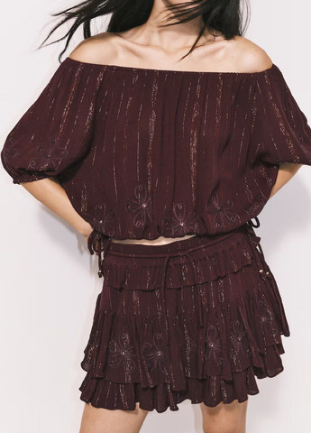 Короткая блузка из жатой вискозы с мерцающими металлическими нитями и вышитым мотивом. Вырез горловины «балет», рукава реглан до локтя и узкая кулиска с бисером по обеим сторонам подола. Потайная резинка и сборка по вырезу горловины, манжетам и подолу.
