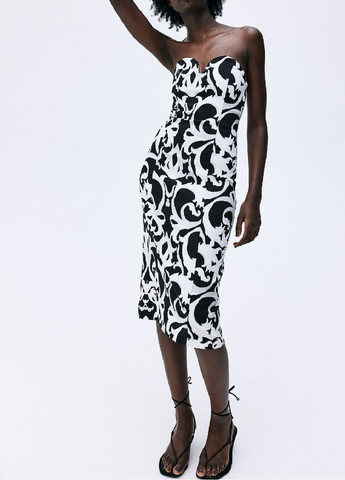 Облегающее фигуру платье-бандо длиной до икры из тканого материала со встроенными косточками для создания идеального выреза в форме сердца. Фигурные швы спереди и сзади, потайная молния и застежка на крючки сбоку, прямой низ с разрезом сзади. На подкладке сверху.