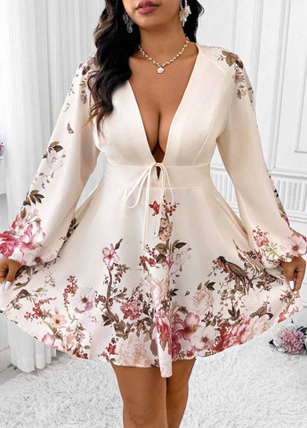 Сексуальное мини-платье Viva Relle Plus Size белого цвета. Платье имеет облегающий А-силуэт. Высокая талия и расклешенный низ. Глубокий V-образный вырез. Идеально подходит для вечеринок и свиданий. Платье дополнено оборкой и узлом.