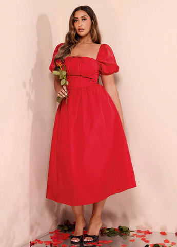 Красное платье больших размеров SHEIN BAE. Длинное красное платье с квадратным вырезом и рукавами-буфами. Платье расклешенного А-силуэта с высокой талией.Застегивается на молнию. Можно стирать в стиральной машине или подвергать химчистке.